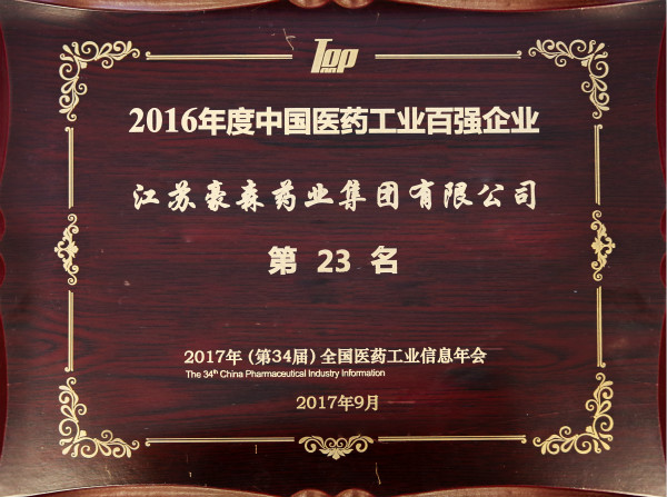 豪森药业荣膺2016年度中国医药工业百强企业23强